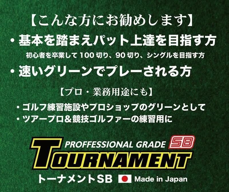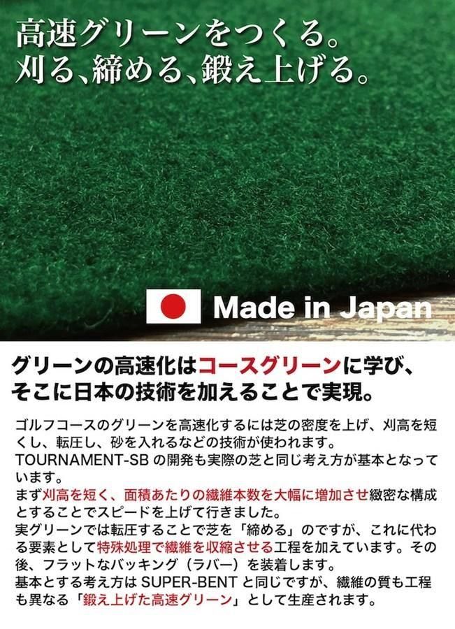 「本芝再現」としてベストセラーとなったSUPER-BENTパターマットの設計思想を受け継ぎながら、新しい高速グリーンとしてTOURNAMENT-SB(トーナメントSB)が誕生しました。 名門コース・トーナメントコースをイメージした高速ベント芝を志向しています。
